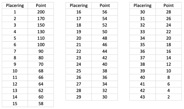 Ved pointlighed ses først på hvem der har flest første, anden osv. pladser. Herefter brydes lighed til fordel for den, der er bedst placeret i sidst gennemførte afdeling. Ingen ryttere kan placeres på en "delt" placering.